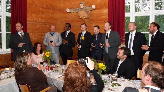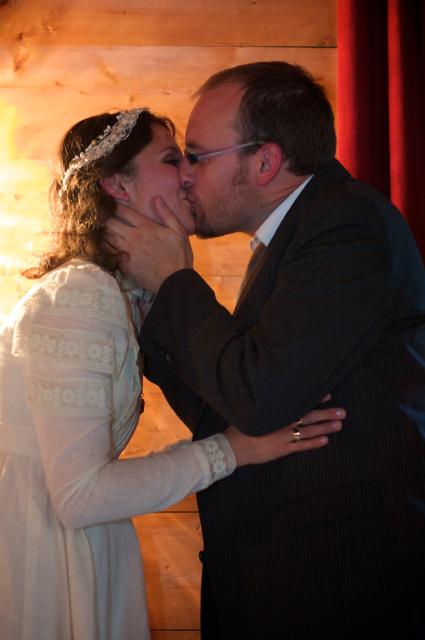 På Galleri Bodøgård overvar vi en flott seremoni i regi av Human-Etisk forbund. Vi hadde eneste baby tilstede under seremonien, da vigsleren hadde skremt de fleste fra å ta med seg slike. Men i motsetning til de fleste andre som hadde barnevakter, hadde ikke vi noe annet valg enn å ha henne med. Emilie storkoste seg under seremonien - hun var litt trøtt og satte derfor stor pris på alle sanginnslagene. Etterpå fikk hun masse skryt av gjester og brudefolk som var imponerte over hvor “snill” hun hadde vært :-)